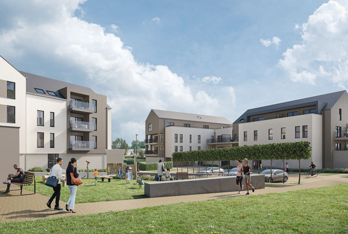 Construction de 4 immeubles de 92 appartements, parkings, espaces publics et communautaires, aménagement des voiries dans le quartier du Wäschbour à Arlon.© Polygone