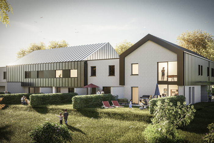 Construction de 6 logements en habitat groupé à Tintigny. La résidence se compose de 5 maisons et 1 appartement avec de larges terrasses et des jardins.Vues extérieures © Another Factory